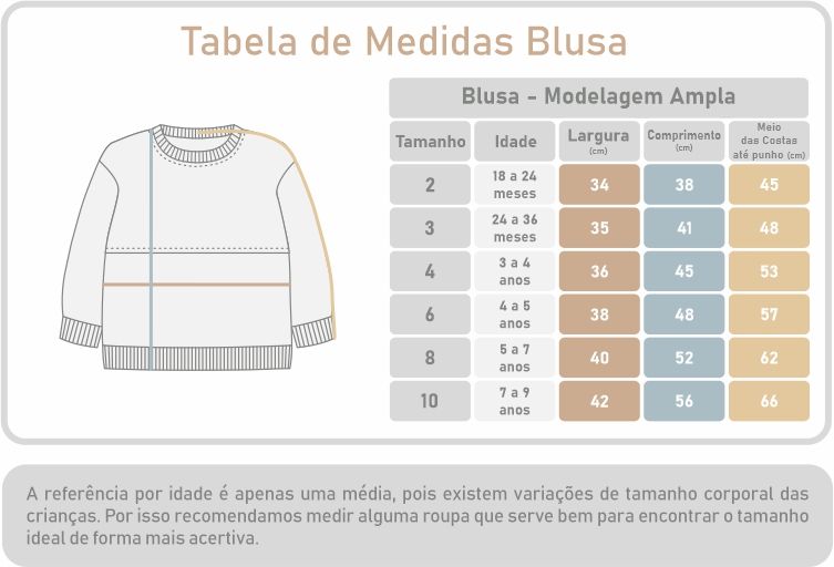 | Modelo | Decote redondo com ribana, Bainha nos punhos e na cintura |