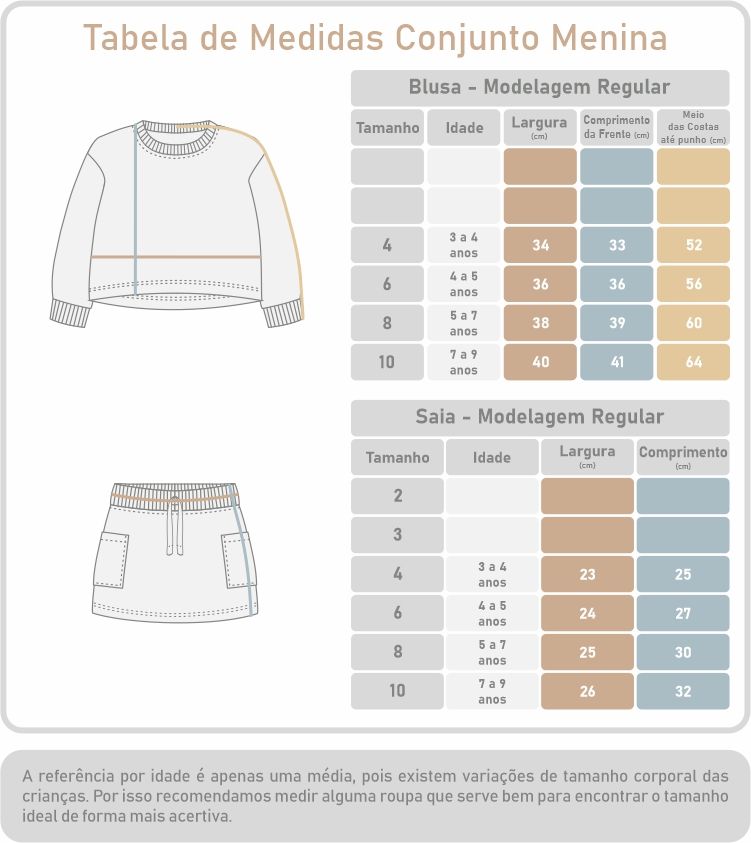 | Modelo | Blusa: Decote redondo com ribana, Ribana nos punhos e Bainha na cintura - Saia: Ribana na cintura com elástico, Cadarço decorativo, Bolsos laterais sobrepostos, Shorts interno ajustado ao corpo. |